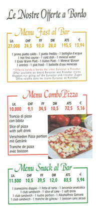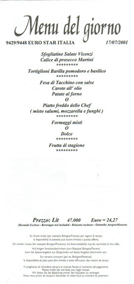 フィレンツェからナポリまではユーロスターで移動します。今ではユーロスターといえばイギリスとフランスを結ぶ国際列車を指します。しかし、ユーロスターの名称を巡って後発の英仏間を結ぶユーロスターと対立したことがあり、結局イタリア側が譲歩してユーロスターの前に「イタリア」を冠することで決着したのだそうです。ミラノからナポリまでは大して時間がかかりません。ちょうどランチタイムを挟んでいたので、食堂車に出かけて昼食を頂くことにします。軽めですが、コースメニューを注文します。