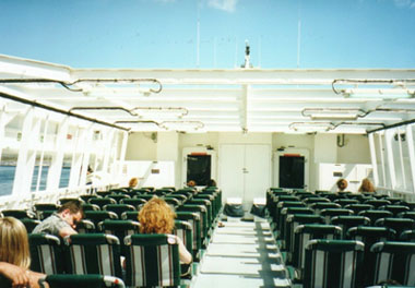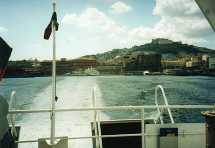 ホテルで大きな荷物を預け、最小限の荷物を持ってカプリ島に向かいます。カプリ島はナポリから30km程の距離にあり、ホテルの目の前にあるサンタルチア港から高速船で1時間位で到着します。折角ですから、展望デッキに座ってナポリの眺望を楽しみます。