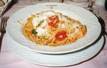 パスタも頂きましょう。『SPAGHETTI/PENNE AL POMODORO/BURRO』、パルメジャンチーズが山とかかっています。