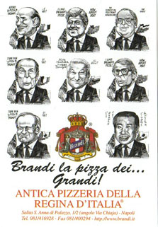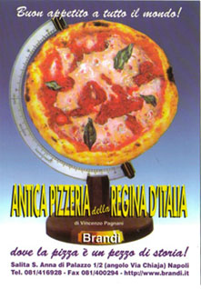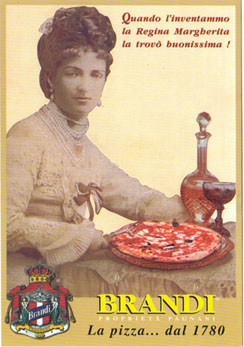 The outcome of this auspicious royal judgement was that pizza with mozzarella and tomatoes was christened margherita in pizzerias throughout Naples and elsewhere, in the same way that a slice of steak with an egg on top is called a Bismarck. I would also like to show you something", said Mr Brandi, taking out a piece of paper, all yellowed with age. This proved to be from His Majesty's offiial "taster", expressing the pleasure of the royal household with the excellent pizzas. Here is a copy of the curious document: