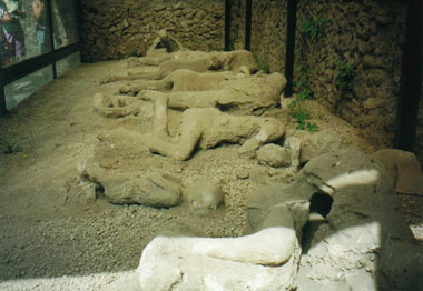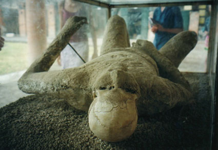 遺跡のあちこちにはガラス箱に入った人間の遺体が収められています。体の姿勢から判断すると、逃げ惑う中で一瞬のうちに火山灰に埋もれてしまったようです。生きながらミイラになってしまったのかも。