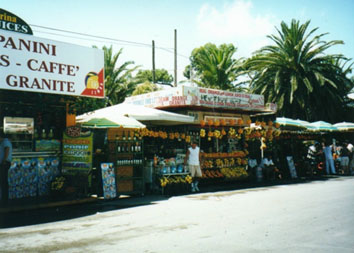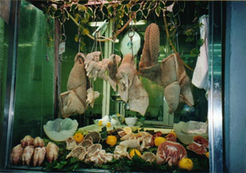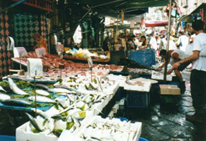 今日は古代都市ポンペイの遺跡を訪れます。ナポリからポンペイに行くには幾つか方法がありますが、ヴェスヴィア周遊鉄道を使うのが便利なようです。ヴェスヴィア周遊鉄道はナポリ中央駅が始発駅です。列車に乗る前に、中央駅近くにある市場を見物します。路地裏には沢山のお店が並んでいて、活気にあふれています。