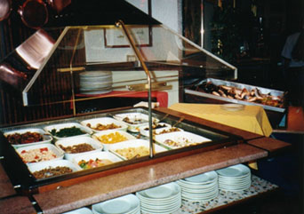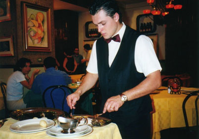 お店のスタッフはかなり本格的な正装をしています。丸のお魚料理では、テーブル横でナイフを使って切り分けてくれます。