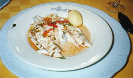 ア・クッカーニャの売りは、注文すれば入り口近くのケースに並べられた魚介類を調理して出してくれること。生簀料理とまではいきませんが、地元のお客さんは勿論のこと、観光客にも人気があるみたいです。
