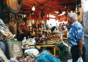 ホテルに到着後、荷ほどきもそこそこにヴッチリア市場に向かいます。大通りを20分ほど歩いて、路地に入りますとカラッチョロ広場の周囲に沢山の屋台が軒を連ねています。元々は肉だけを扱う市場だったそうですが、現在は魚・野菜・食材など雑多なお店が並んでいます。茹蛸おじさんはどこにいるんでしょうか?