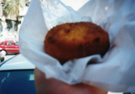 茹蛸の代わりに、シチリア名物の(ナポリでも売っていましたが)アランチーノを頂きます。アランチーノはシチリア郷土料理で「小さなオレンジ」という意味だそうです。味付けした米をオレンジくらいの大きさにしてパン粉を付けて揚げ、中にはミートソースやモッツァレッラチーズなどが入っています。イタリア語で果物のオレンジのことをアランチャといいますが、このライスコロッケがオレンジの形に似ているのでアランチーノと言うようになったらしいです。