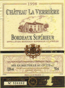 - (赤) フランス: CHATEAU LA VERRIERE BORDEAUX SUPERIEUR (1998)