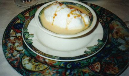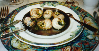ディナーは、ホテルに併設されたレストラン「ド ラ ポルテ ギローム」で頂きます。前菜はエスカルゴです。さすがに本場の味は格別ですぅ。それにしても、下のお皿の柄の美しいこと!