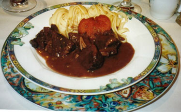 メインはブルゴーニュ郷土料理の牛肉の赤ワイン煮です。ジュヴレ・シャンベルタンがすすみます。