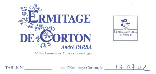 折角ブルゴーニュワインのメッカであるボーヌに来たんだし、お食事もボーヌで一番のレストランであるエルミタージュ・デ・コルトンで頂くんだし、これはもうシャンパン→白→赤→コニャックのフルコースを行くしかないですね。シャンパンはグラスで飲みますから、先ずは白ワインから選ぶことにしましょう。この地でボルドーは論外ですね。本場の優雅なブルゴーニュか、辛口のシャブリか、コクのあるマコンか、それとも美味しいボジョレーか。。。そうなんです、ボジョレーと言えばヌーボーの赤というイメージが思い浮かぶのですが、あまり日本ではポピュラーではないものの白もまた美味しいのです。散々迷った末にこのボジョレー・ビラージュの白を選びました。どうでしょうね?