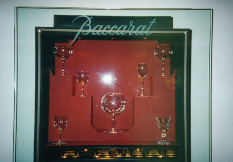 ワイングラスにもいろんな種類がありますが、ここに並べられているものは有名なバカラ社製です。中央の球形のグラスは、特級赤ワイン用と思います。口が狭く、中がバルーンのように膨らんでいるため、少量のワインを入れてゆっくりとかき回すと芳醇な香りが中に閉じ込められ、特級ワインの実力が如何なく発揮されるのです。