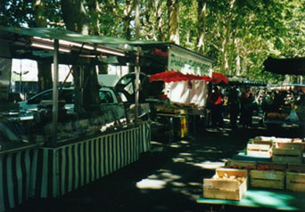 フルヴィエールの丘から下り、ソーヌ川を渡って新市街に戻ってきます。ソーヌ川沿いは大きな歩道があり、青空市場(マルシェ)が開かれていました。100以上のお店が軒を連ね、リヨンの中でも大きな青空市場だそうです。
