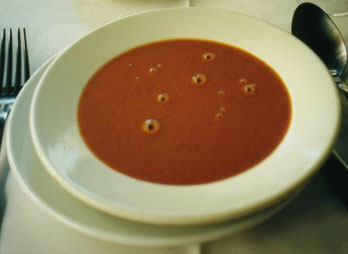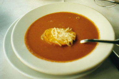 最初は魚の旨みがしっかり溶け込んだ魚介類のスープです。魚介類のスープといえば、マルセイユのブイヤベースが有名ですが、私は具のないスープ・ド・ポワソンの方が好きですね。サフランを使った濃厚なスープにチーズを載せたパンを沈めます。たっぷりとスープを吸ったパンは魚介の旨みたっぷりで、これがまた白ワインとの相性が抜群です。