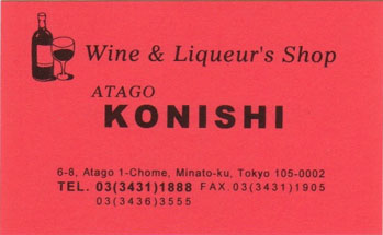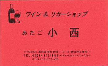 週末で人通りの閑散とした霞ヶ関の官庁街を過ぎて虎ノ門に出ます。暫く歩いていきますと、いつもと違った道に進んだようで標識には愛宕と書いてあります。まわりにはビルが建ち並んでいますが、地形的には山のような感じです。ふ〜〜〜ん、ここが愛宕山かぁ。おや、こんなところにホテルが。。。お馴染みの東急インですね。通りに面したレストランの入り口には、『ビール飲み放題!90分1,200円!』とあります。おっ、喉もかわぴてきたひ、ピルルでも。。。と気分は高揚しますが、残念ながら5時からオープンとのこと。誘惑に打ち勝つのもおしゃんぽの大事な心構えのひとつです。さらに歩いていきます。ふと見上げますと、『田崎眞也のワインサロン』という看板が電柱にかかっています。矢印は横の路地を向いているのですが、小さな道が山の上に続いているだけでお店のある雰囲気ではありません。誘惑に打ち勝って探すのは止め、前方に目をやりますと『小西』というおしゃれな看板が見えます。酒屋さんのようです。今度は誘惑に負けてしまいます。