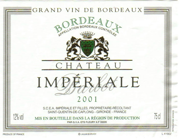 - (白) フランス: CHATEAU BARBOT IMPERIALE BORDEAUX (2001)