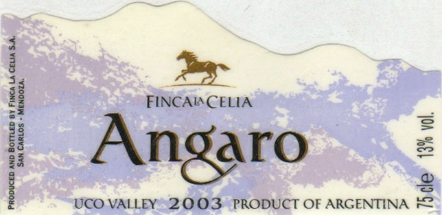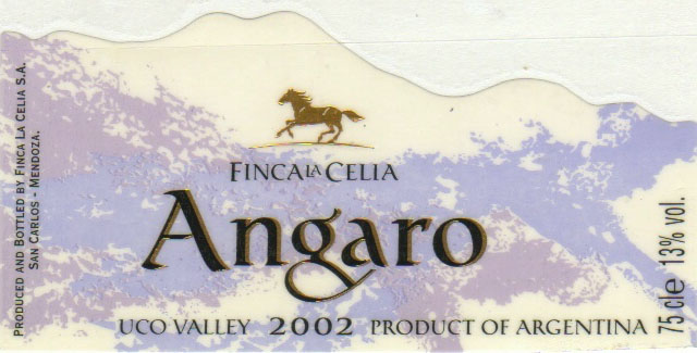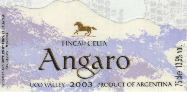 これもラベルに魅かれて買い込んだワインです。久しぶりのアルゼンチンのワインですが、経済危機にもかかわらずその品質は全く衰えていないようです。生産者のフィンカ・ラ・セリア社は、アルゼンチン有数のワイン産地であるメンドーサ地区ウコバレーにあります。マルベリック種はアルゼンチンの赤ワインで使われる代表的な葡萄品種ですが、シラーズ種をブレンドするのは珍しいです。それも半々で。ちなみに、「Angaro」とは英語で「Fine」を意味しています。標高920mのウコバレーで栽培されているマルベック種とシラー種の葡萄は手で収穫され、丁寧な醸造により、果実味豊かでベルヴェットのようになめらかな口当たりのワインになるとのことです。