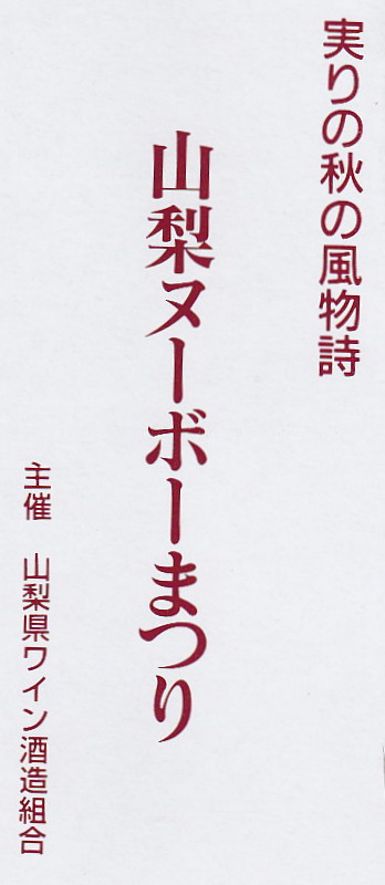 私もこのまま引き下がる訳にはいかず、受付で2千円を払って試飲に加わります。朝から何も食べていないのですが、親切なことに試飲用のグラスにはチーズが一袋付いてきます。とりあえず一杯と、行列のできていないテントに向かいます。試飲できるヌーボーは全部で68種類あり、山梨県のワインメーカー36社が選りすぐったヌーボーです。試飲用のグラスは、フルート型で小さめではありますが、中ほどの目印線までヌーボーを注ぐと結構な量になります。無料の試飲会ならグラスの底にへばりつくくらいしか注がれませんが、有料なので目印線を越える量がドボドボと注がれます。計量栓を付けたボトルもありますが、そうでないボトルは実に気前よく注がれます。他にも試飲したいヌーボーがあるので、ほどほどにと言っても、注ぐ係の人もホロ酔い加減でブレーキが効きません。そんな訳で、全部のヌーボーは試せませんでしたが、総じてフルーティで甘口のヌーボーが多かったように思います。中にはワインになりきらない葡萄ジュースのような味のヌーボーもありましたが。そんな中で、4番のヌーボーはひときわ重厚な味で、他とは全く異質な存在でした。色も驚くほど濃く、とても1−2ケ月で仕上がったヌーボーとは思えません。何回か試飲した後で、家でもう一度試してみようと買い込んだ次第。その結果は?
