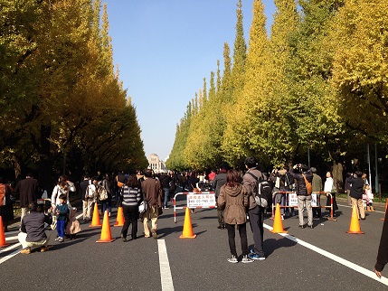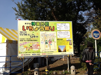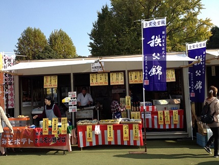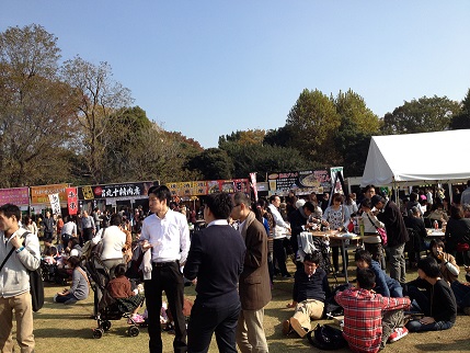 今日は小春日和。日曜日ということもあって、イチョウ並木道には大勢の見物客が詰めかけています。絵画館の方に歩いて行きますと、突き当りの広場に沢山の看板が出ています。私は初めてだったのですが、今年で17回目になる「いちょう祭り」が開催されているんだそうです。広場を取り囲むように、日本全国から集まった名物料理のお店が軒を連ねています。シート持参の家族連れが多く見かけられたのは、このイベントがかなり認知されている証なのでしょう。