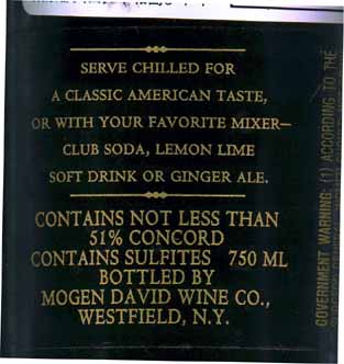 - このワインは極甘口の赤ワインです。よく冷やして、アメリカの伝統的な飲み方(いわゆるストレートか?)でも、あるいはソーダ、レモンライム、ソフトドリンク、ジンジャーエールなどで割っても楽しめます。51%以上のコンコルド(Concord)種のぶどうで造られています。