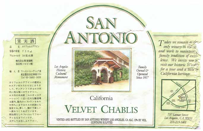 - カリフォルニアワインの歴史はロスアンジェルスから始まりました。サンアントニオは、ロス市内に残る唯一のワイナリーです。ロス市の中央駅(ユニオンステーション)に近い広大な醸造場は屋外、屋内のレストランを併せ持ち、いまではロスの史跡にも指定され、美しく、静かで楽しい一画をつくりあげています。熱処理なしのフレッシュでフルーティな生ワインです。冷やしてお召し上がり下さい。ぶどうの品種は『VelVet Chablis』でしょうか。。。