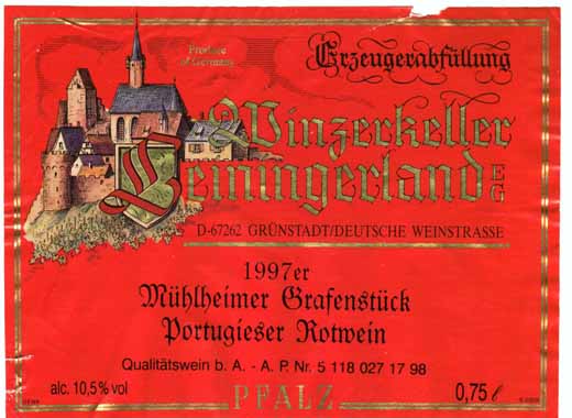 - 『ミュールハイマー グラーフェンシュトゥック』は、ファルツとラインヘッセンの境界に近い小さな町で造られるワインです。輝くような美しい赤色、果実味あふれる風味があり、軽やかな味わいがあります。飲み口のよいやや甘口の赤ワインです。生産者は『ヴィンツァーケラー レイニンガーランド』、生産地域はファルツ地域、等級はQ.b.A.(クーベーアー)、葡萄の品種はポルトギーザー種です。また、このワインは、自家葡萄園元詰のワイン、つまり生産者が葡萄栽培から醸造、瓶詰めまで丹精こめて行い、生産量も限られた手造りの逸品です。ドイツ銘醸ワインといっていいでしょう。